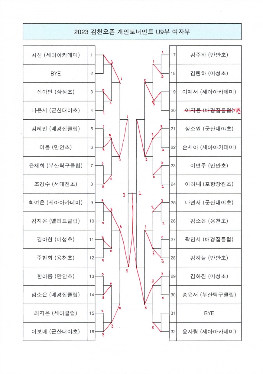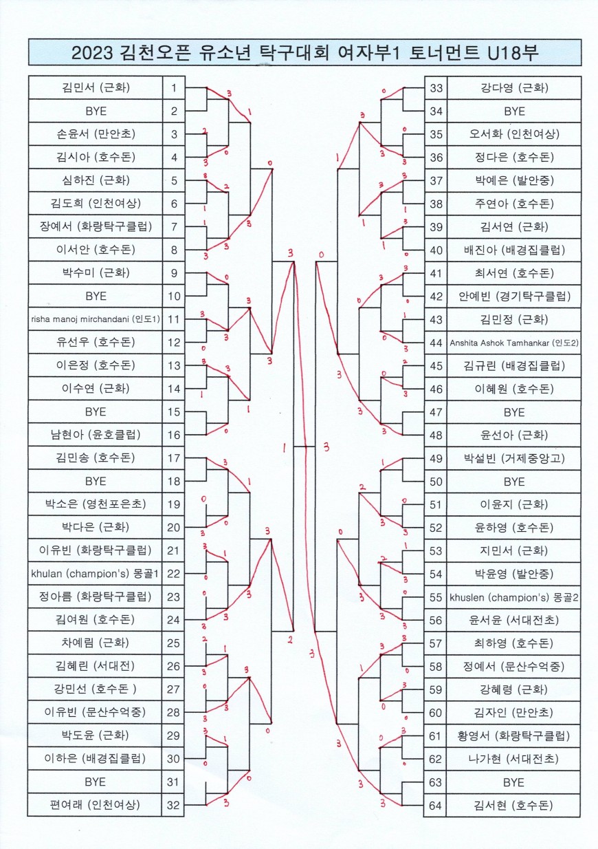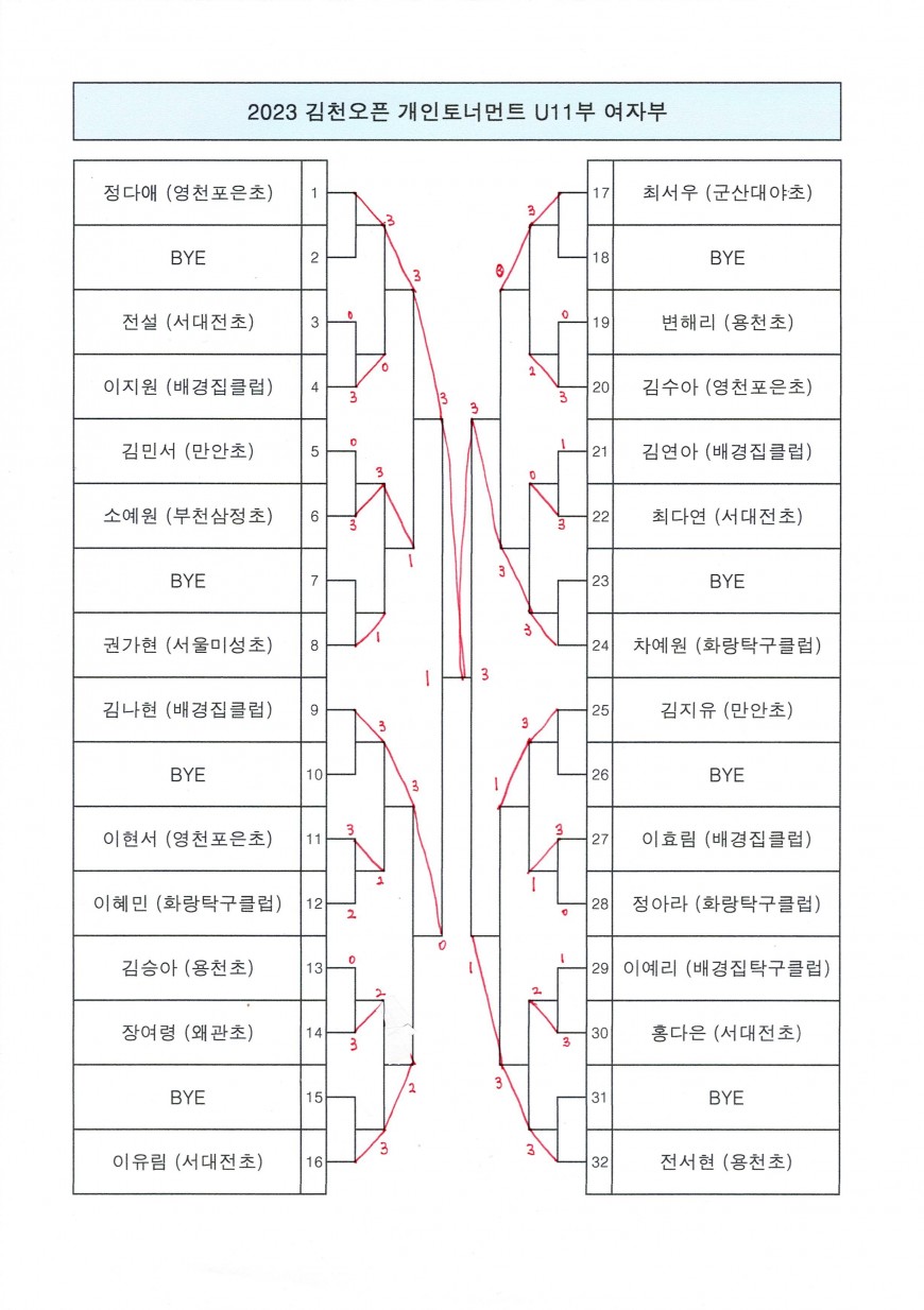 2023 김천오픈 유소년 탁구대회 여자부 참가종목1 개인토너먼트 최종 경기 결과입니다.